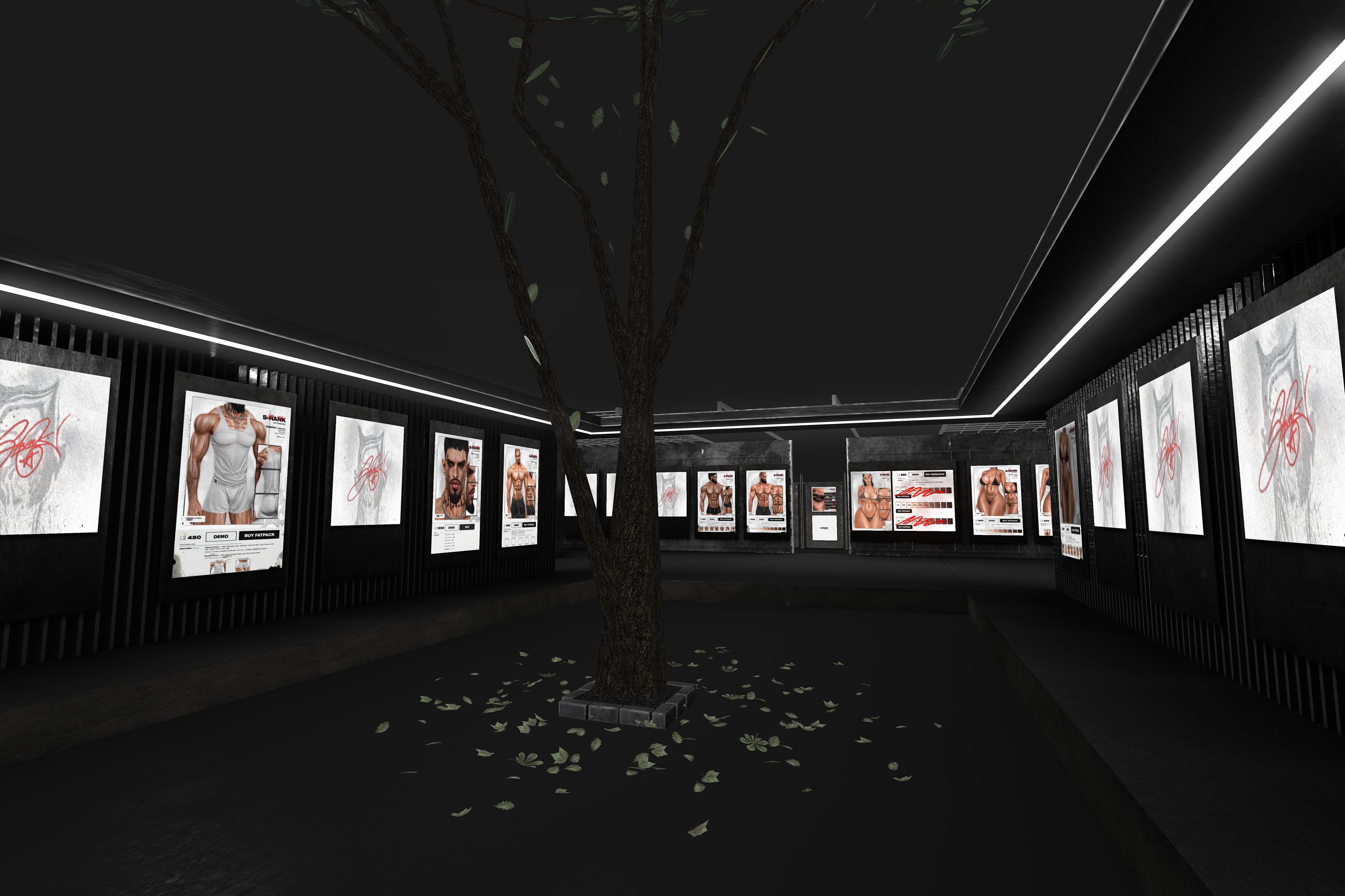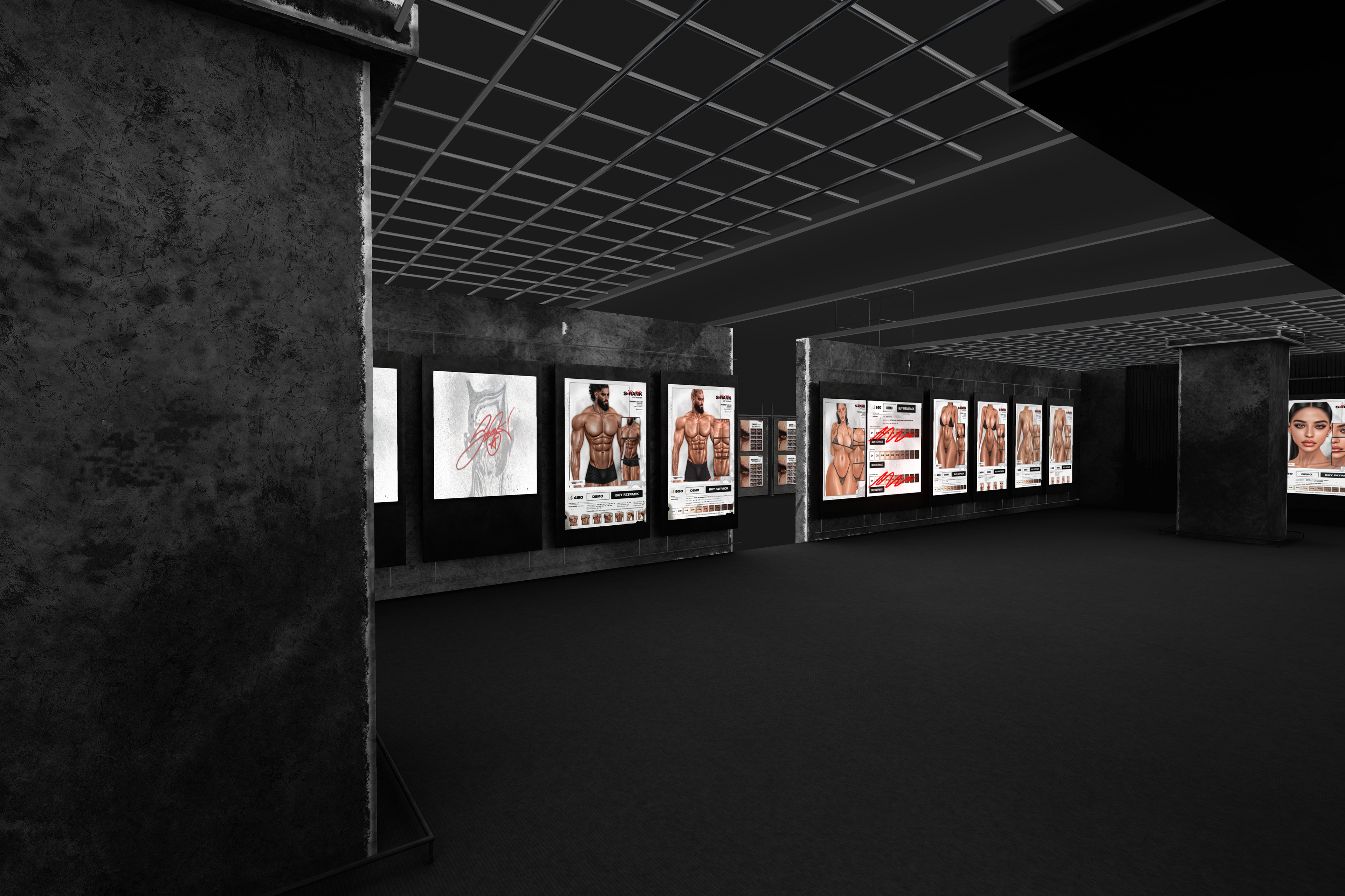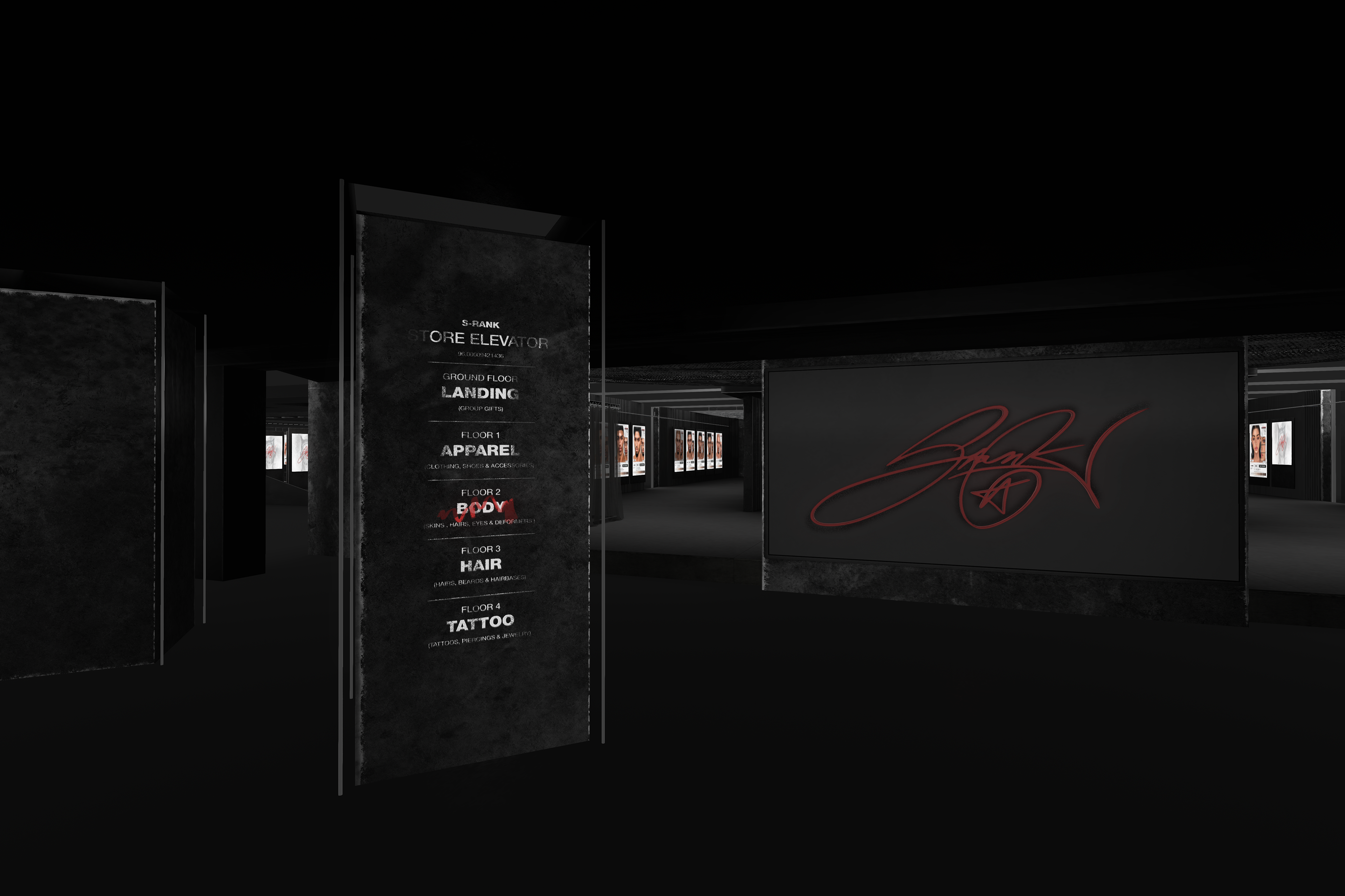 The Body section of the S-RANK flagship continues the brand’s brutalist and industrial aesthetic while shifting focus toward human form and physical identity. This floor is dedicated to S-RANK’s body-related products, including skins, shapes, and enhancements, making it one of the most visually dense and impactful spaces in the complex.