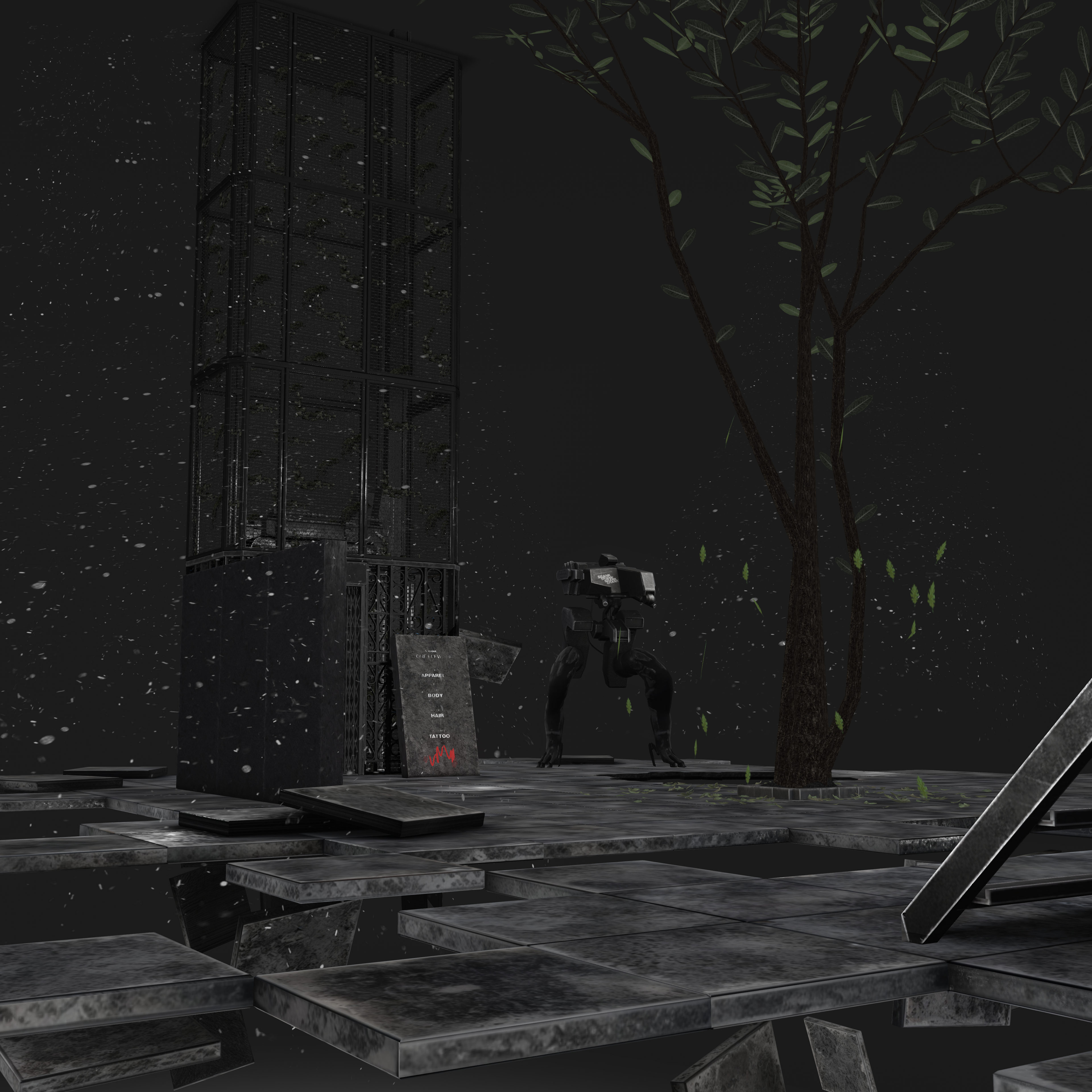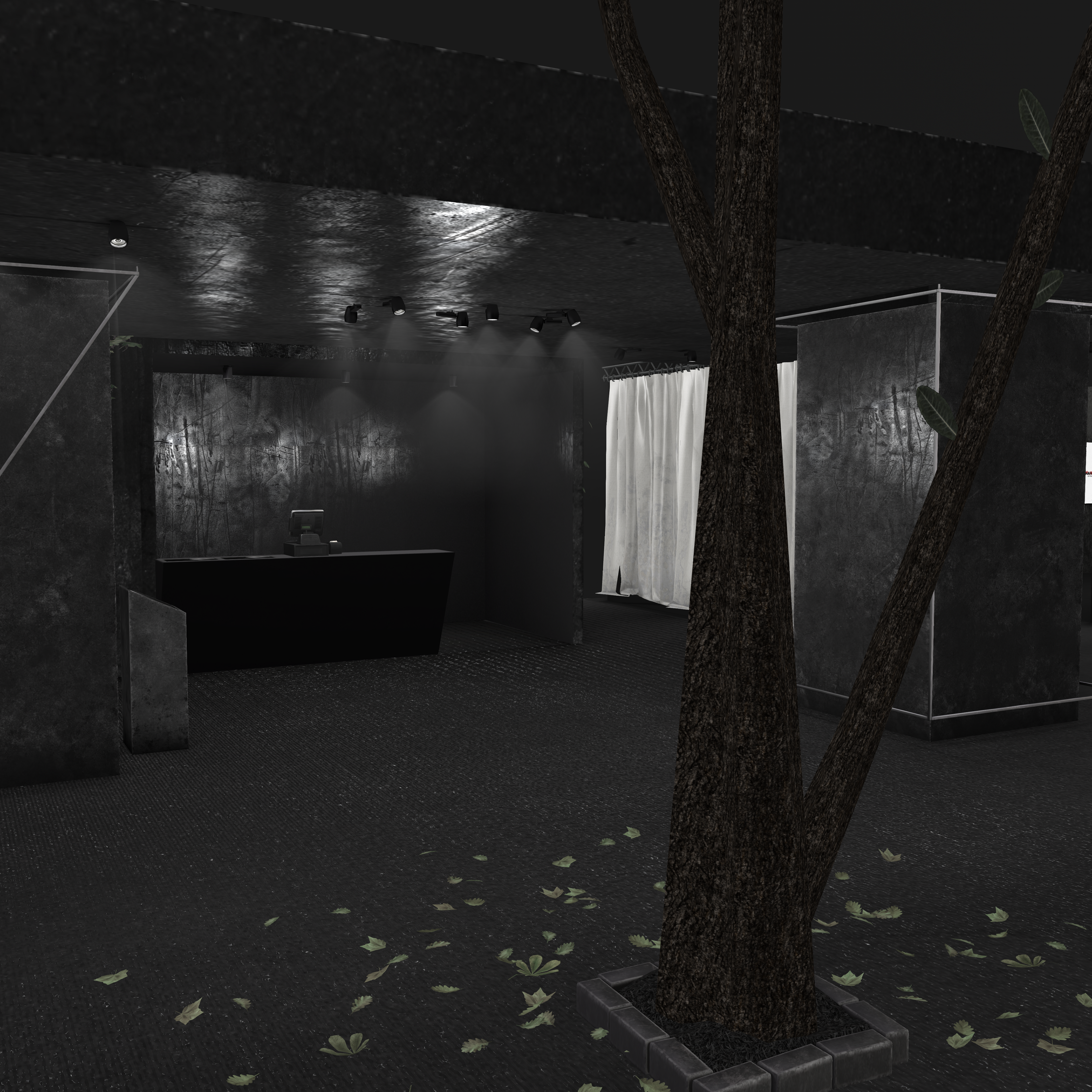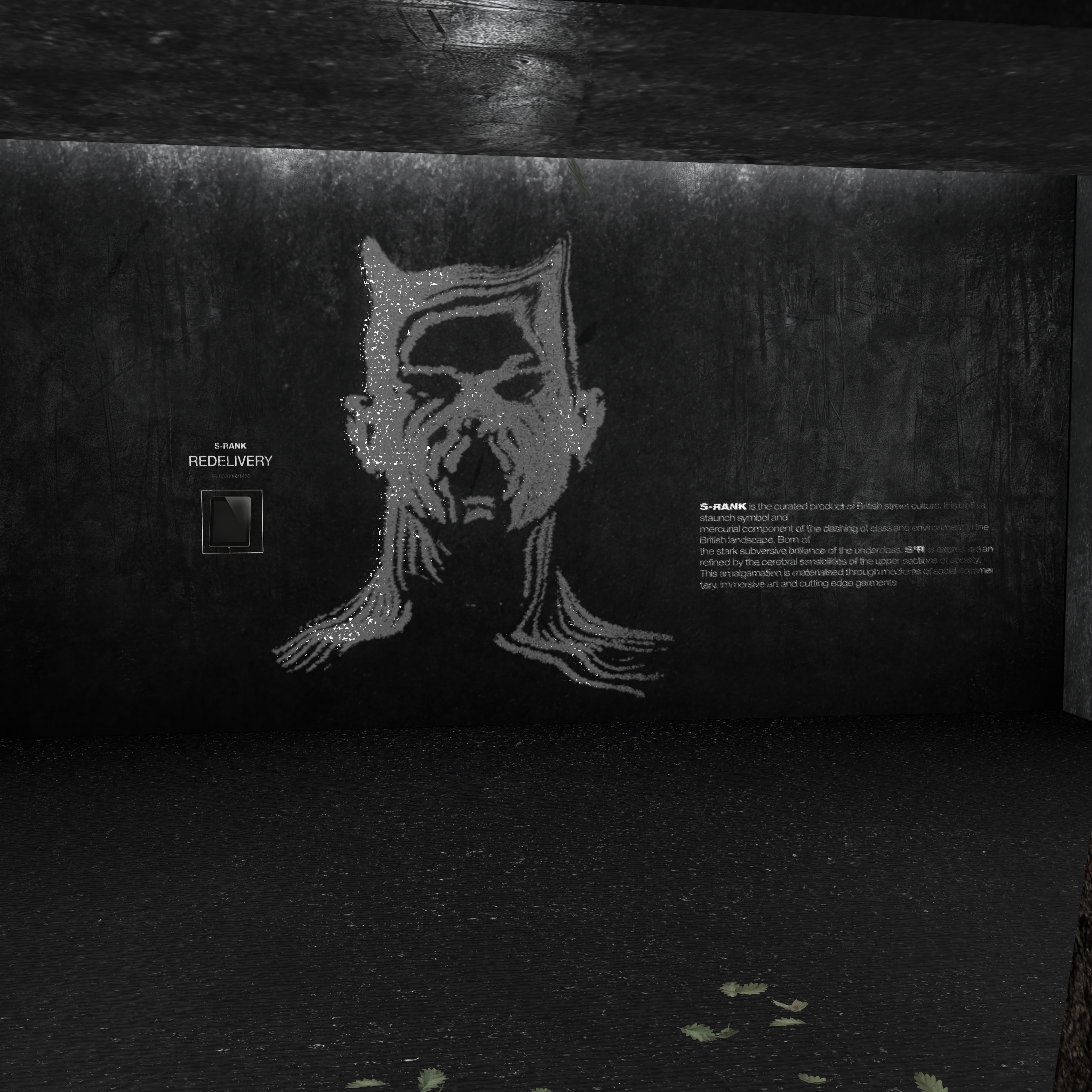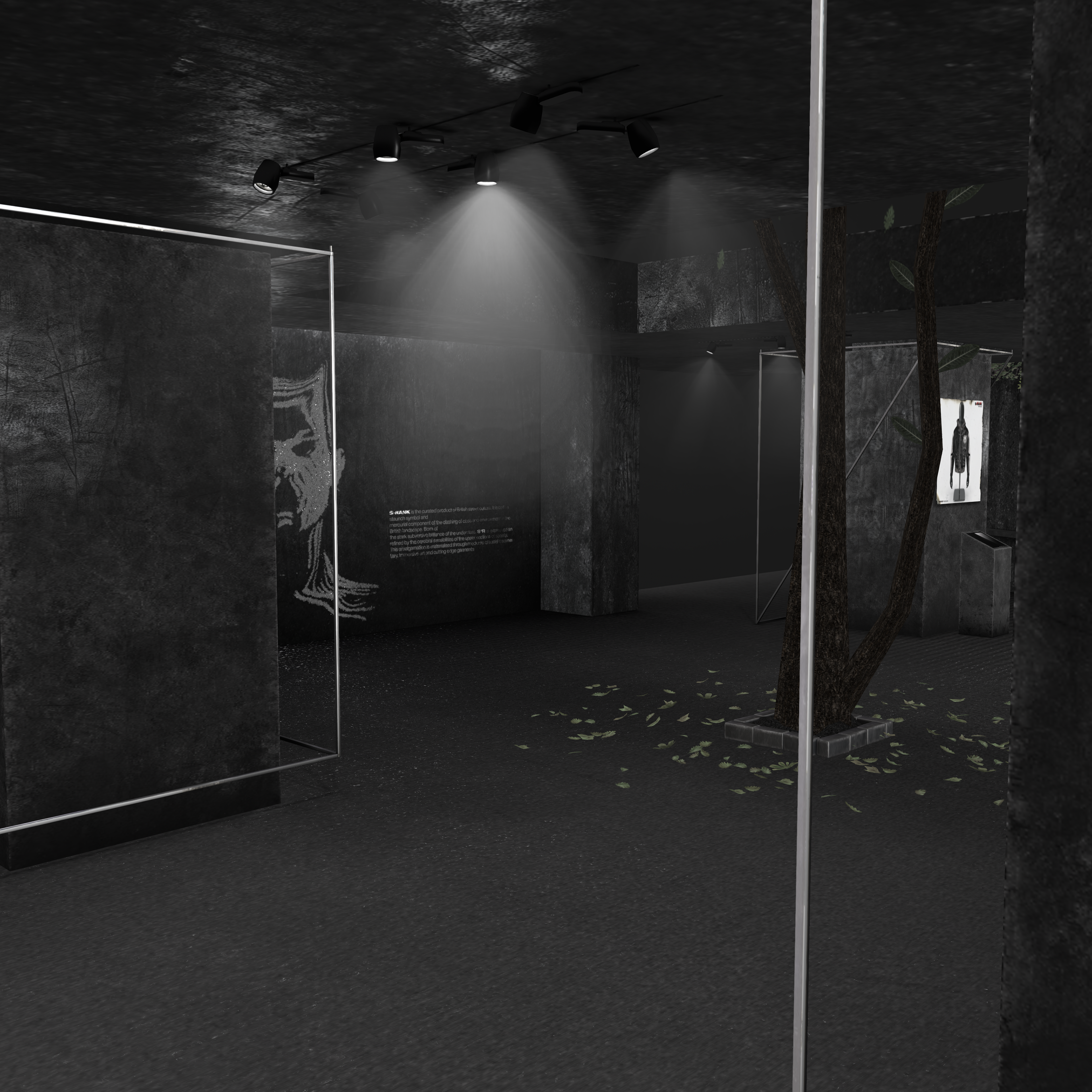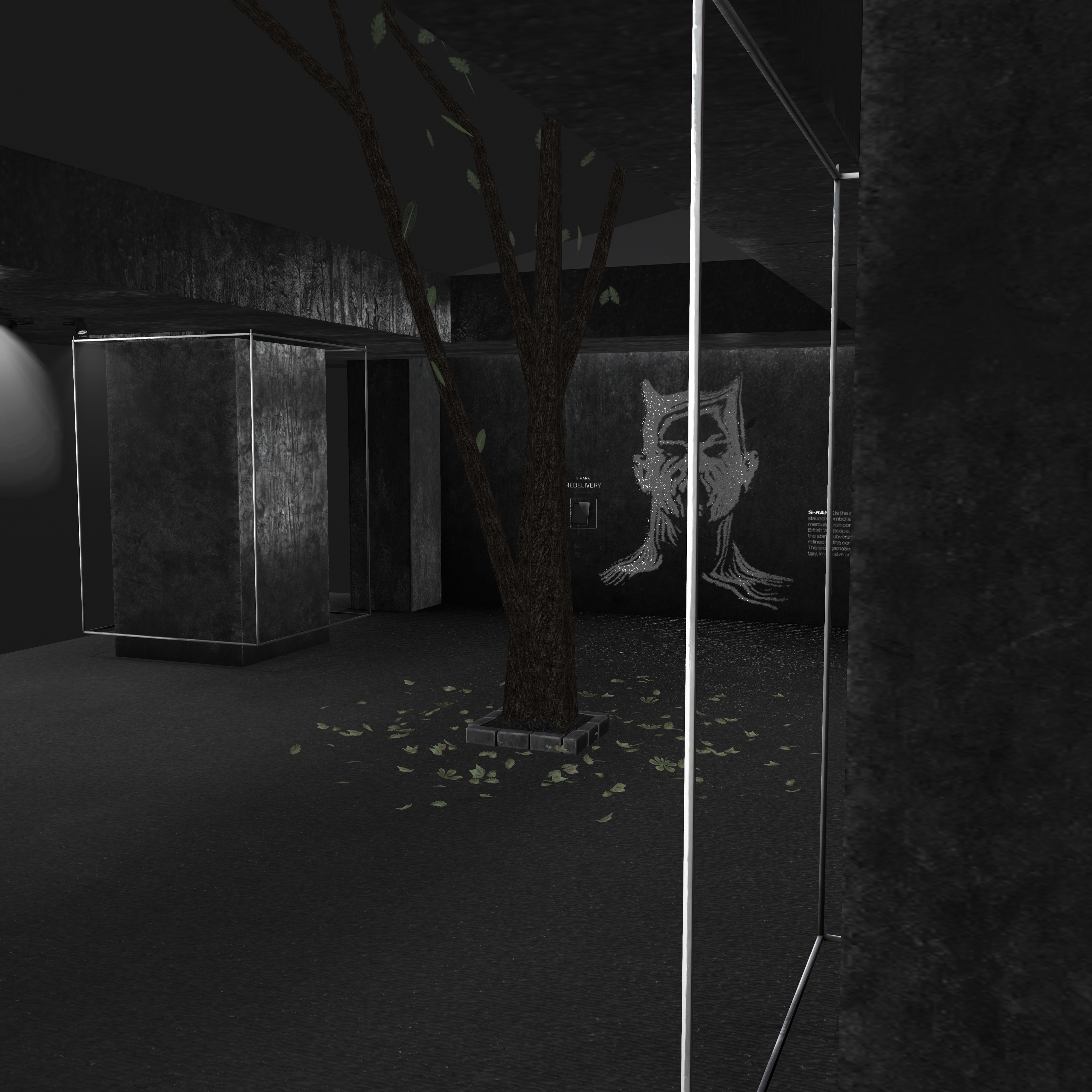 Small natural elements like the tree breaking through the floor and scattered leaves introduce a subtle sense of reclamation — nature interacting with industrial design — tying into S-RANK’s overarching grunge and post-industrial aesthetic.