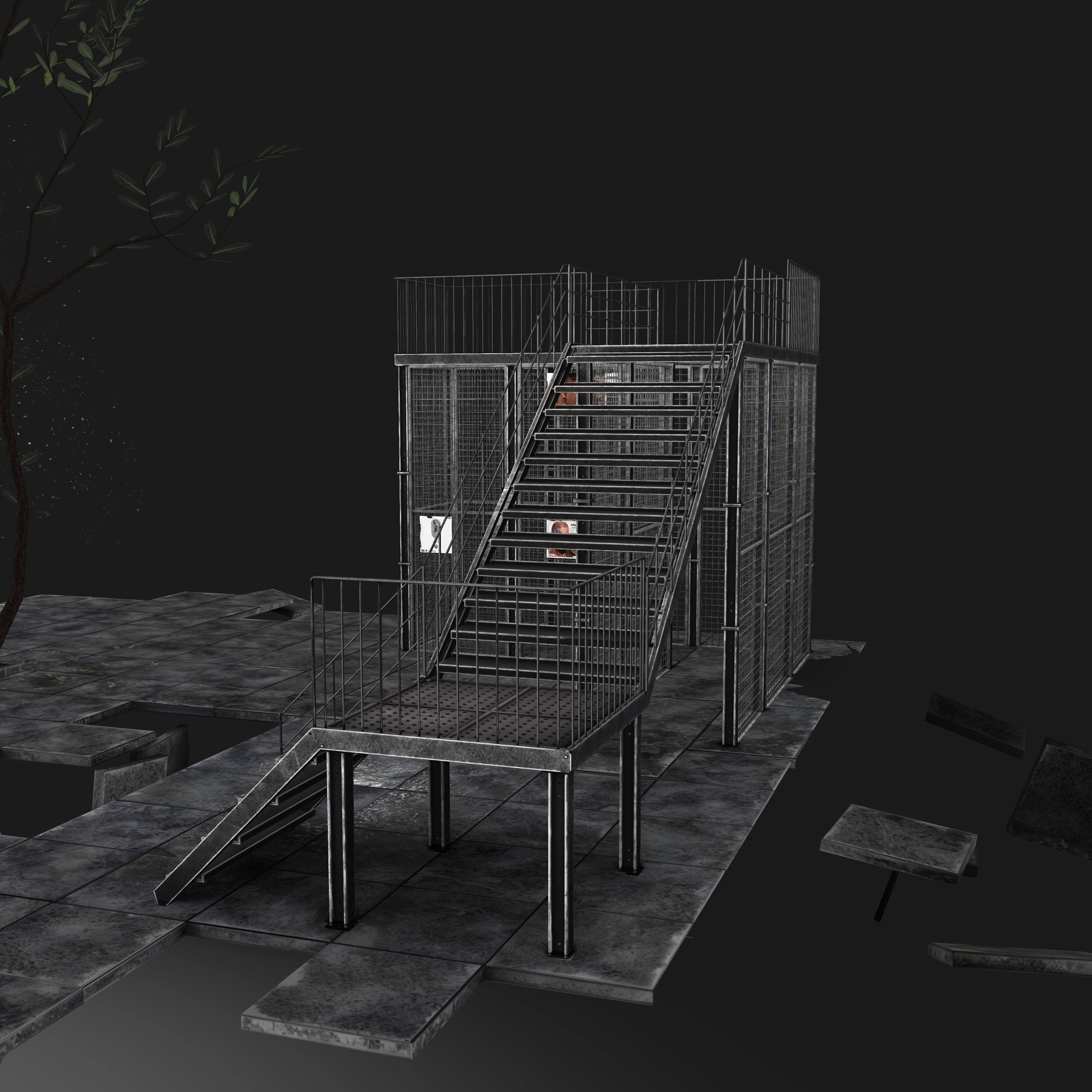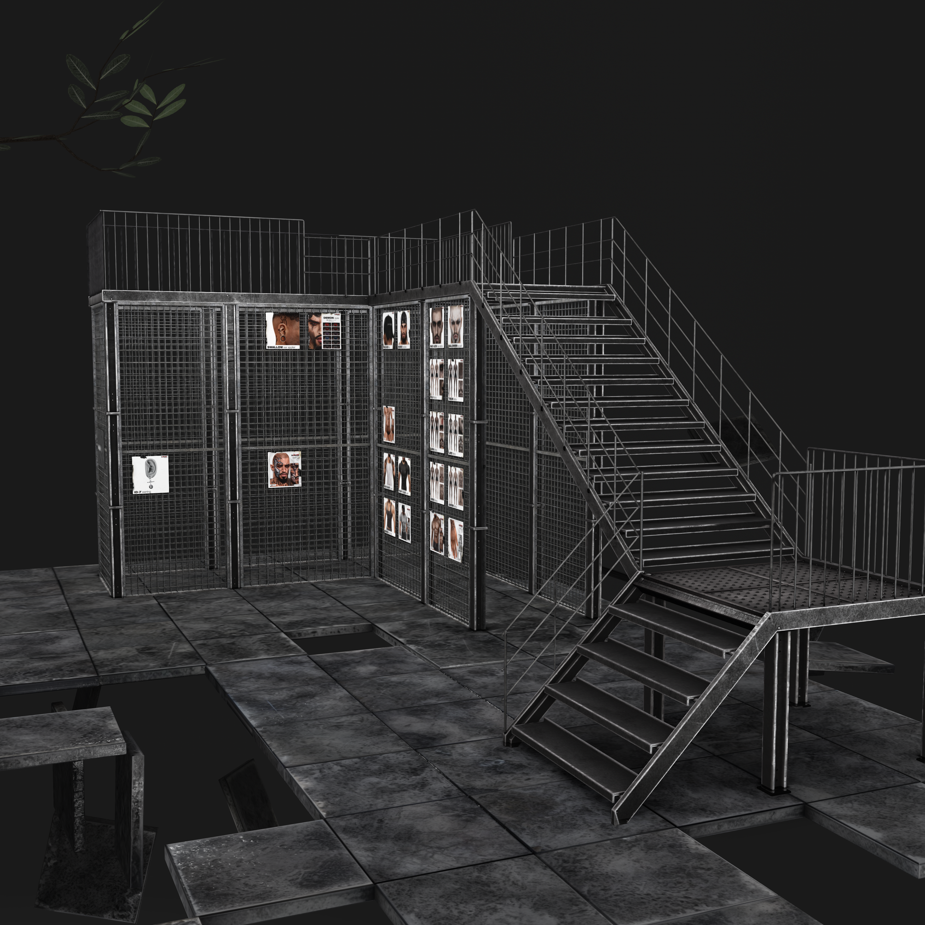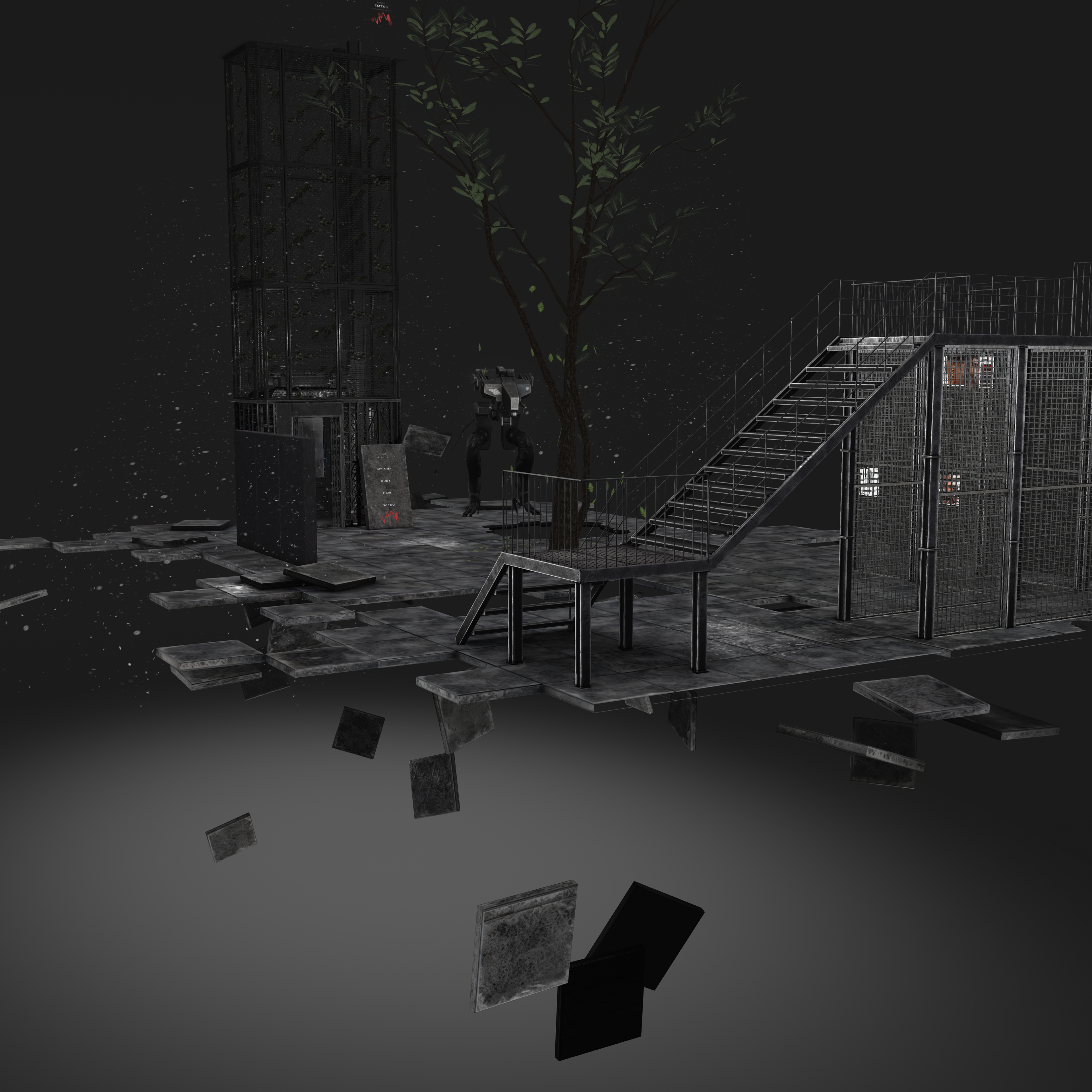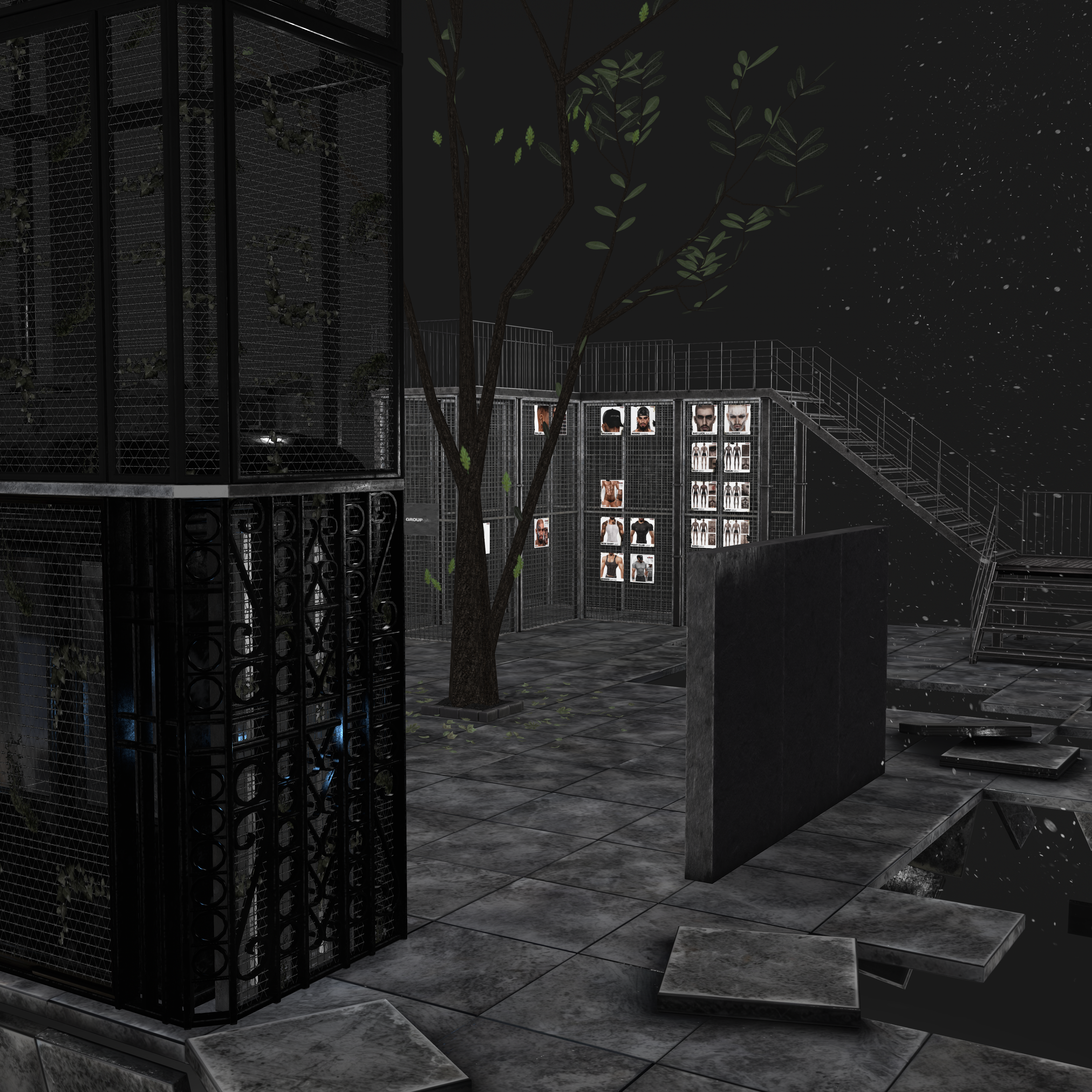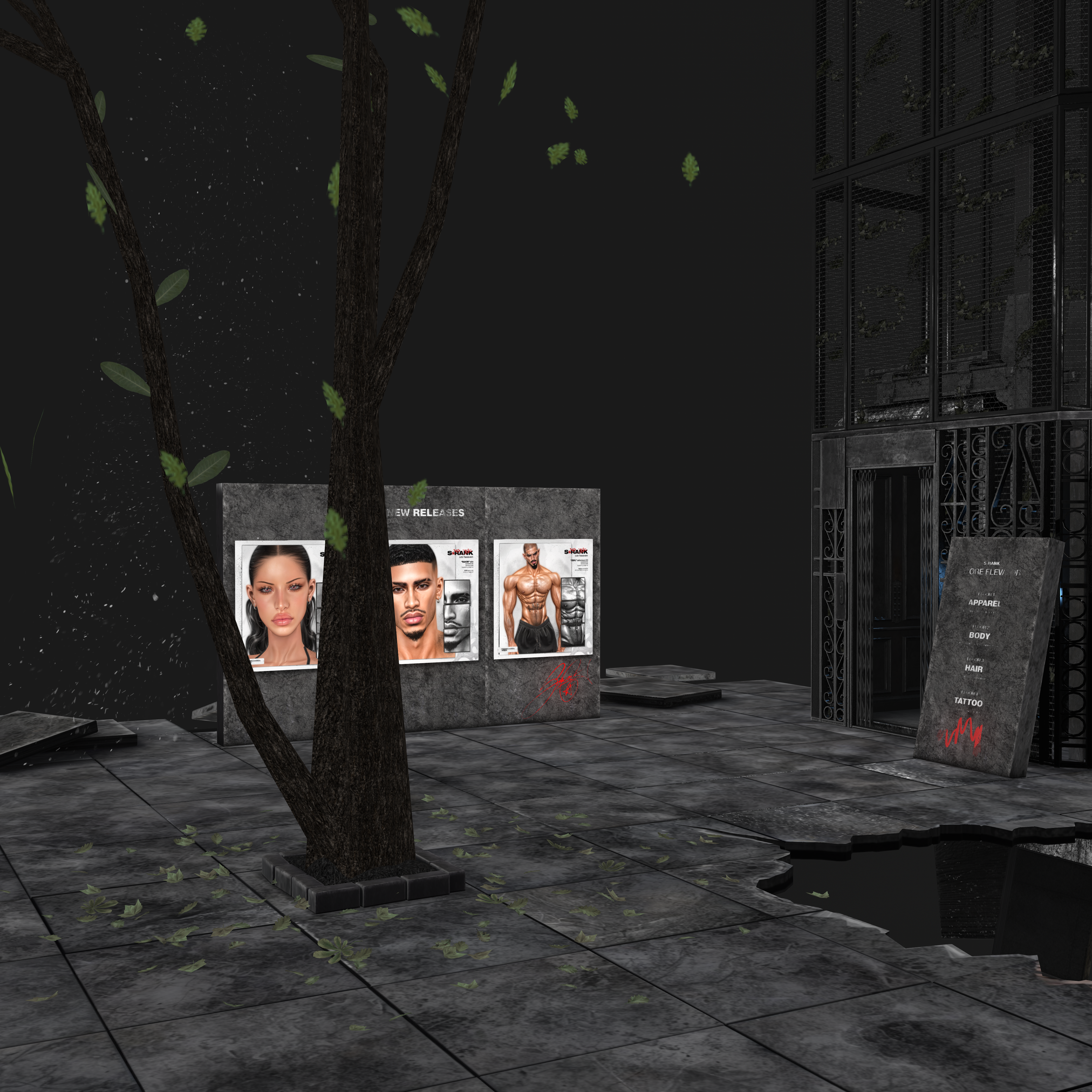 Small natural elements like the tree breaking through the floor and scattered leaves introduce a subtle sense of reclamation — nature interacting with industrial design — tying into S-RANK’s overarching grunge and post-industrial aesthetic.