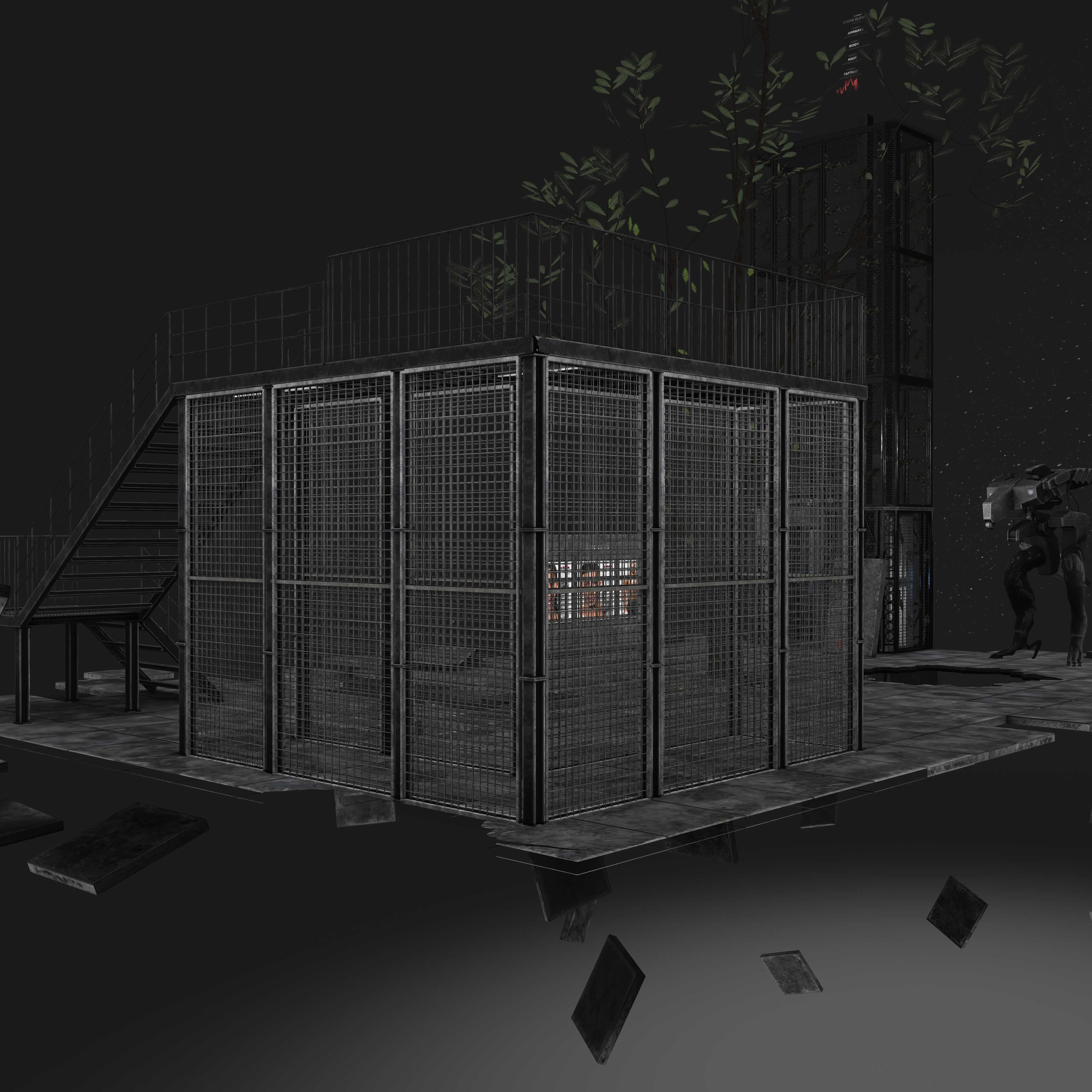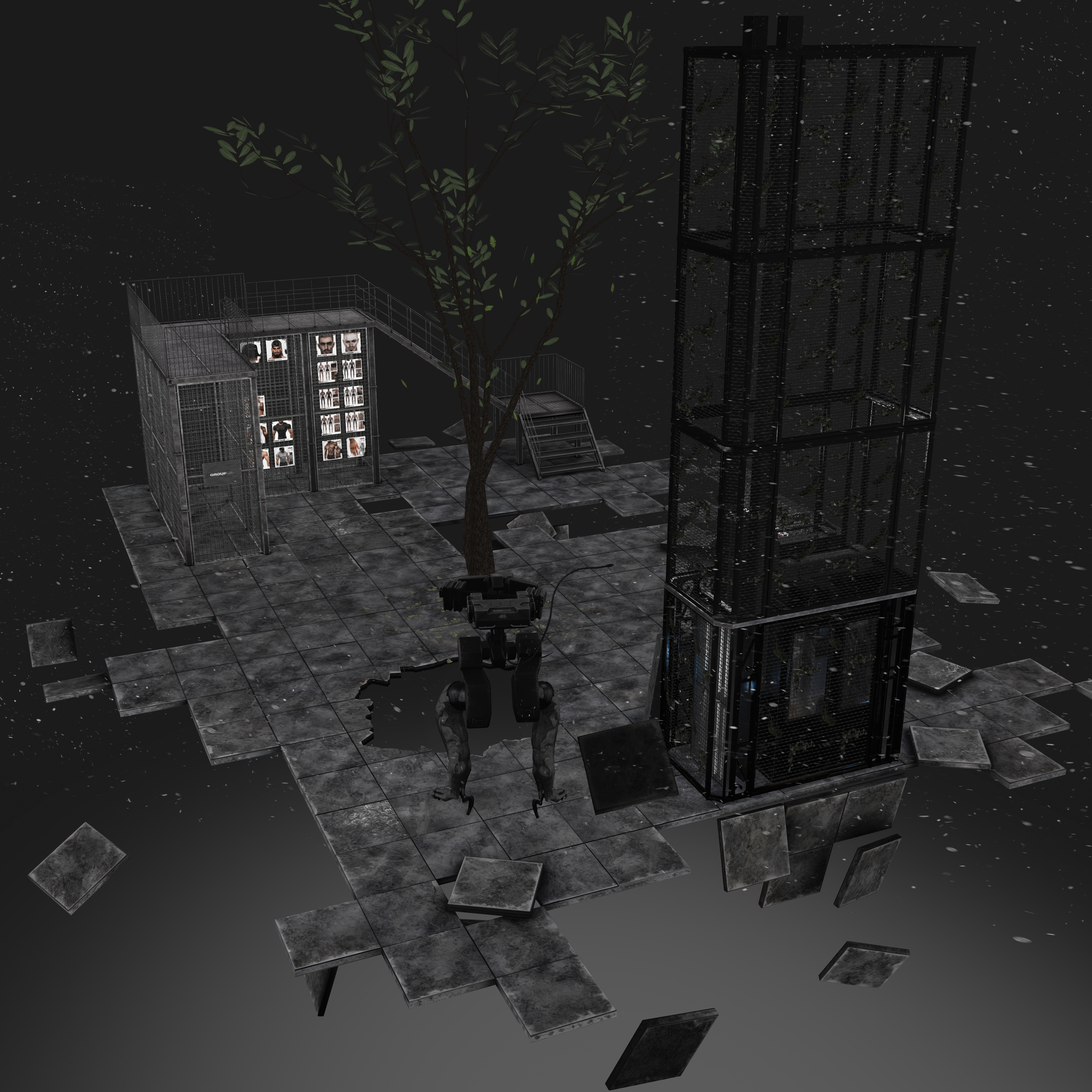 The environment uses raw, utilitarian materials like steel mesh, concrete, and distressed flooring to create a feeling of functional decay. The space is intentionally fragmented, with suspended tiles and exposed framework that suggest a site rebuilt from remnants of the past.