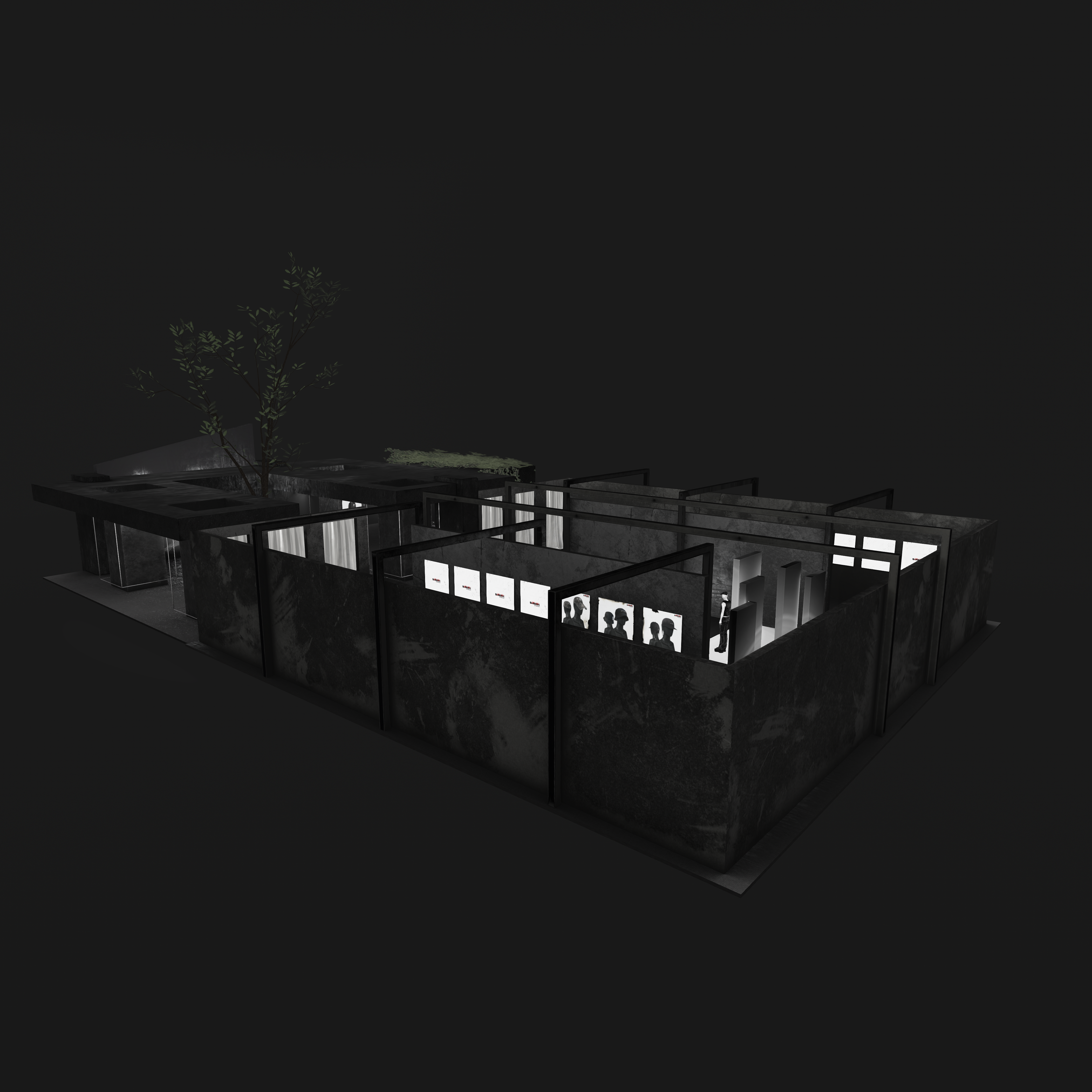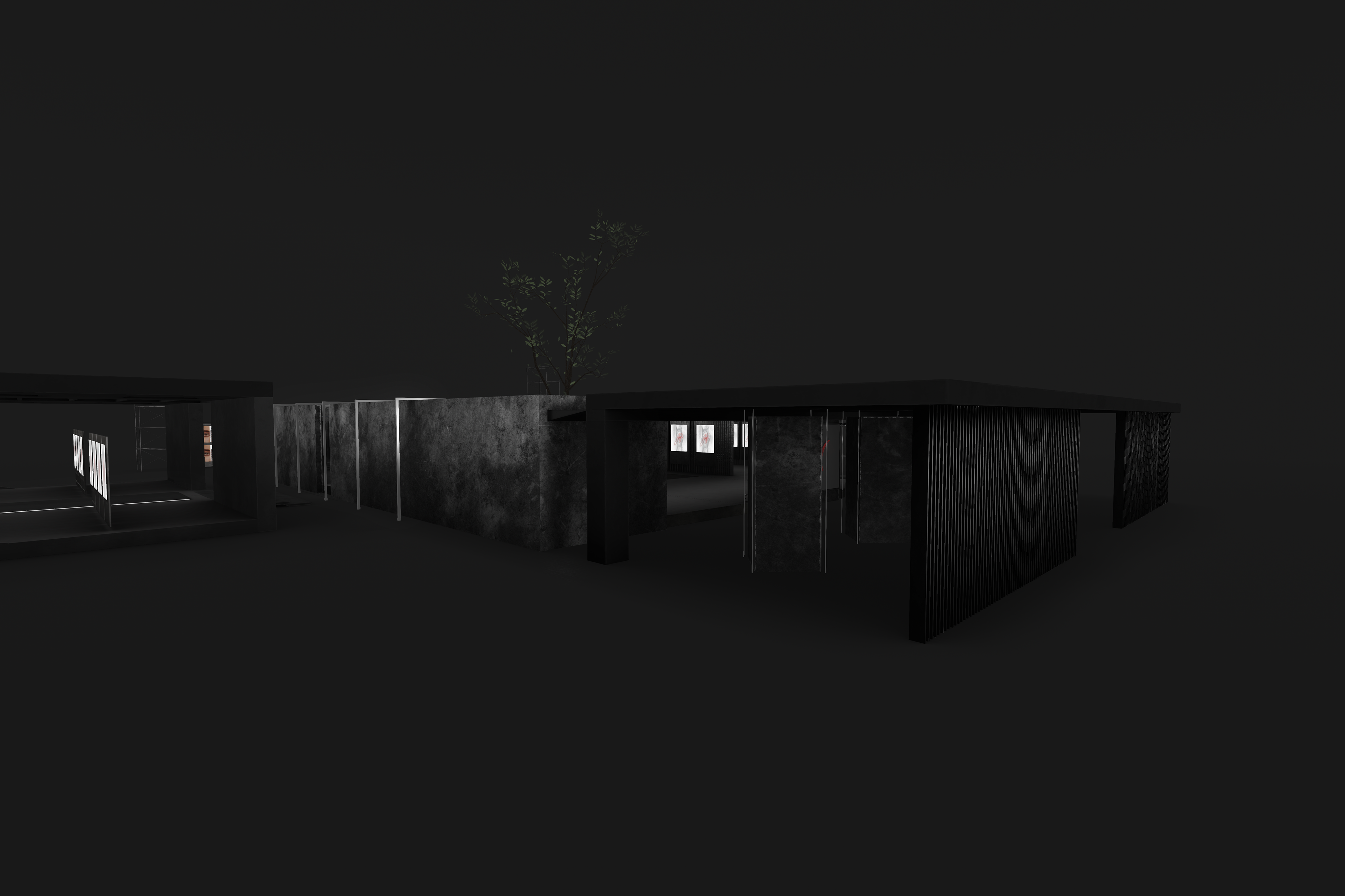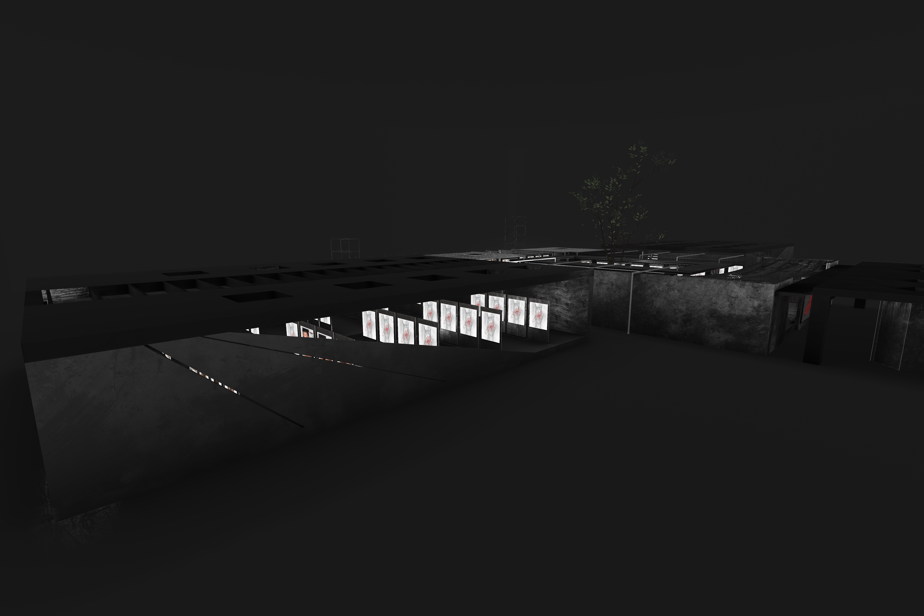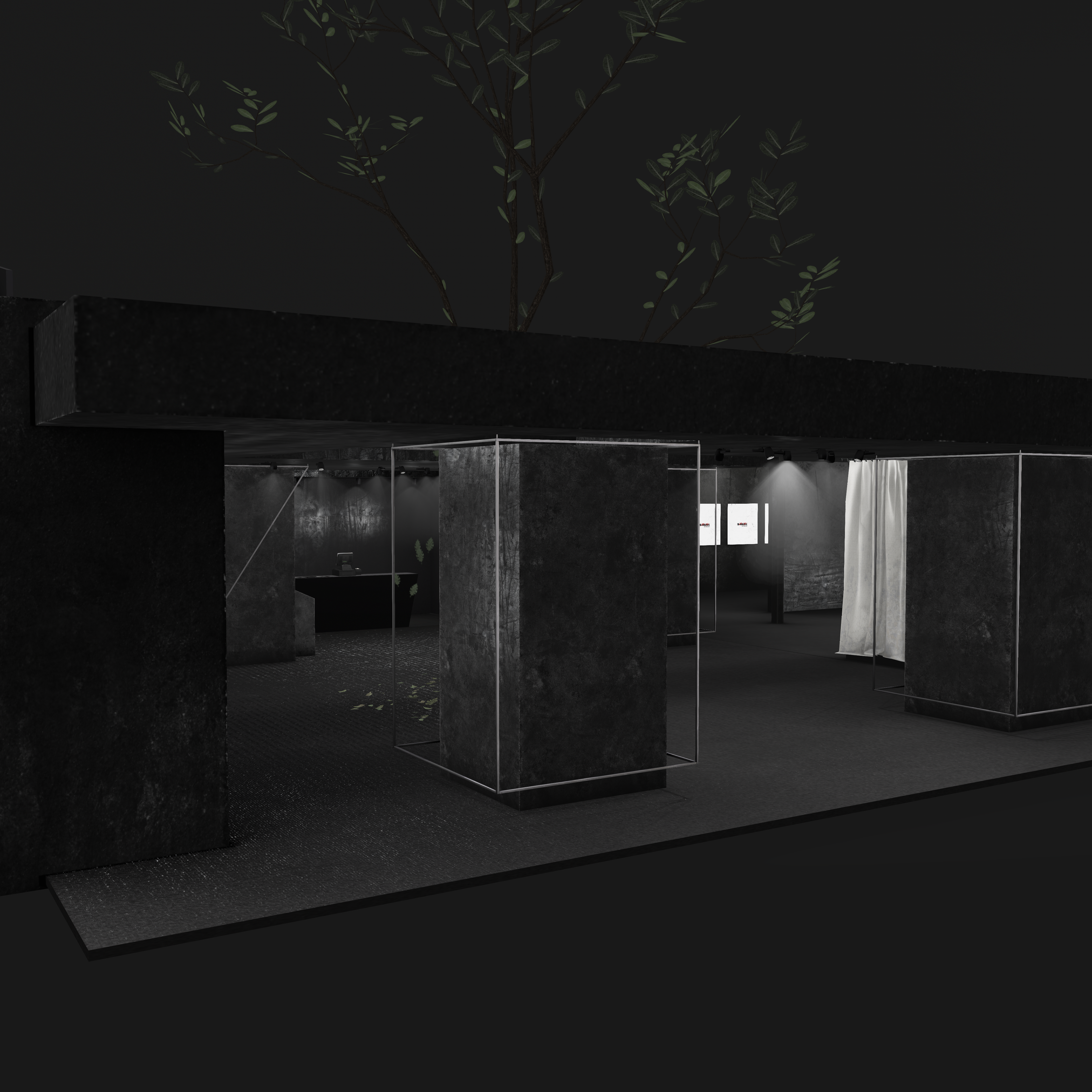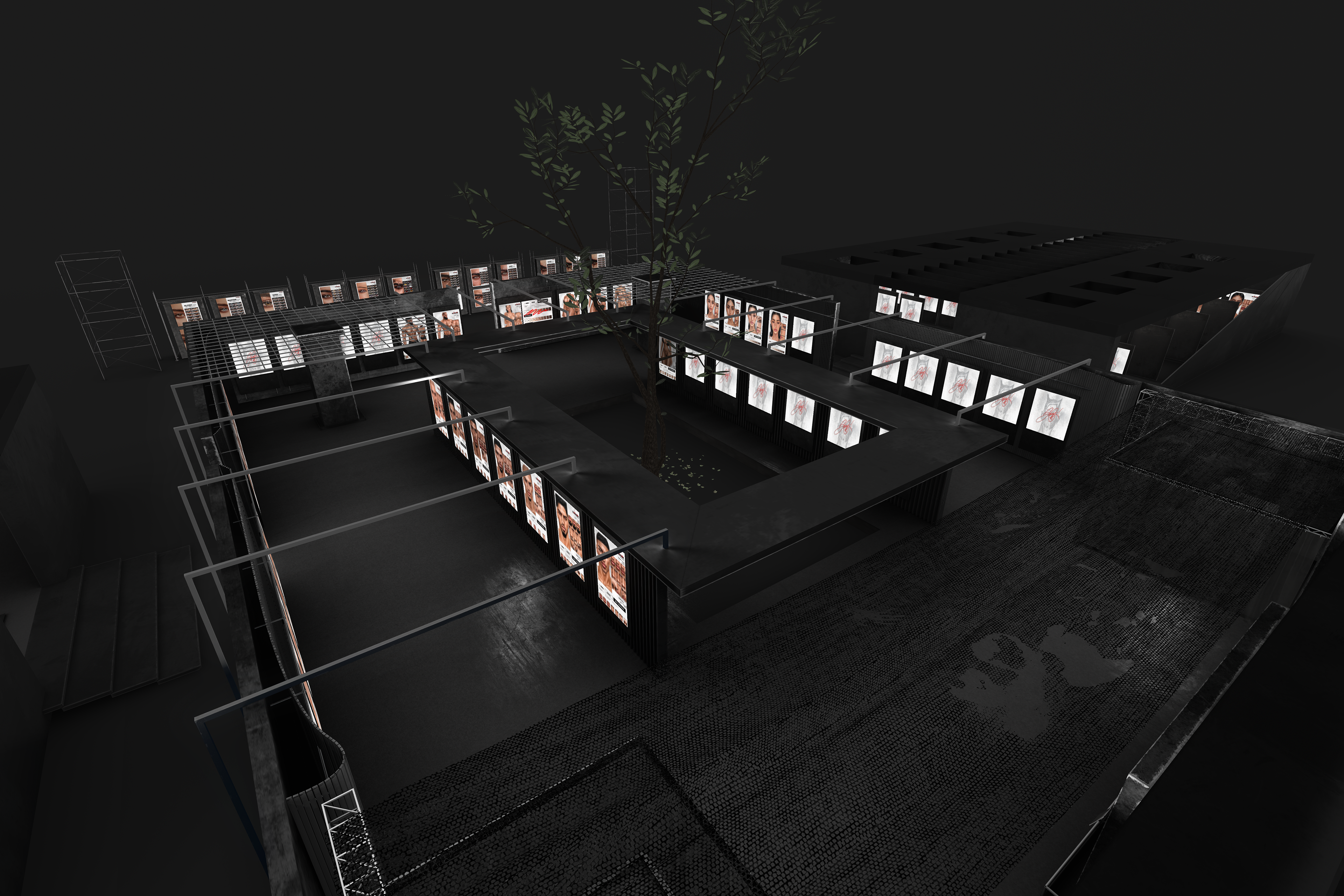 Overhead, mesh ceilings and linear lighting introduce a subtle sense of confinement and order — a nod to industrial architecture — while reflections and shadows across matte surfaces emphasize depth and contrast. A central open courtyard with a growing tree softens the space, serving as a visual counterpoint to the hard materials and structured geometry surrounding it.