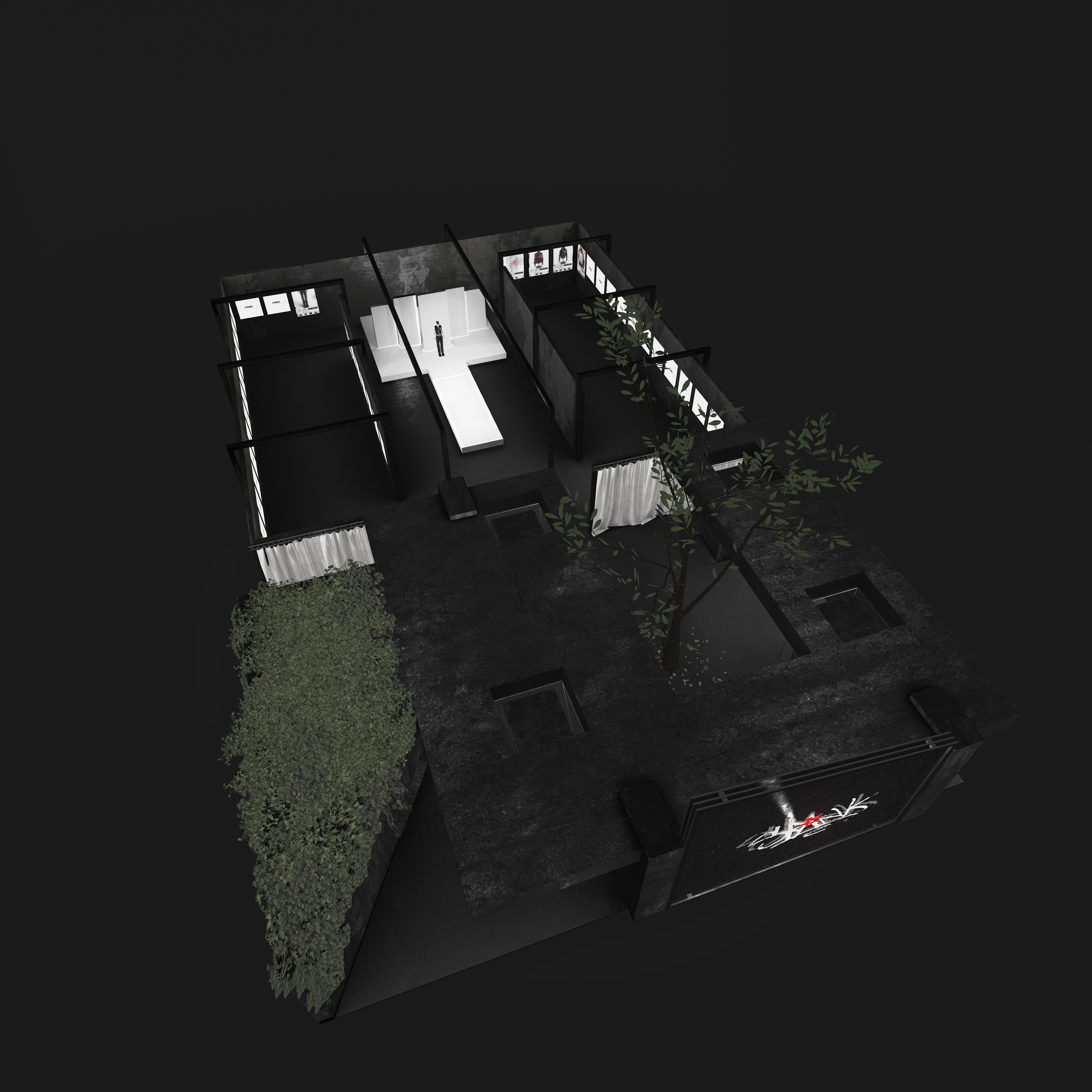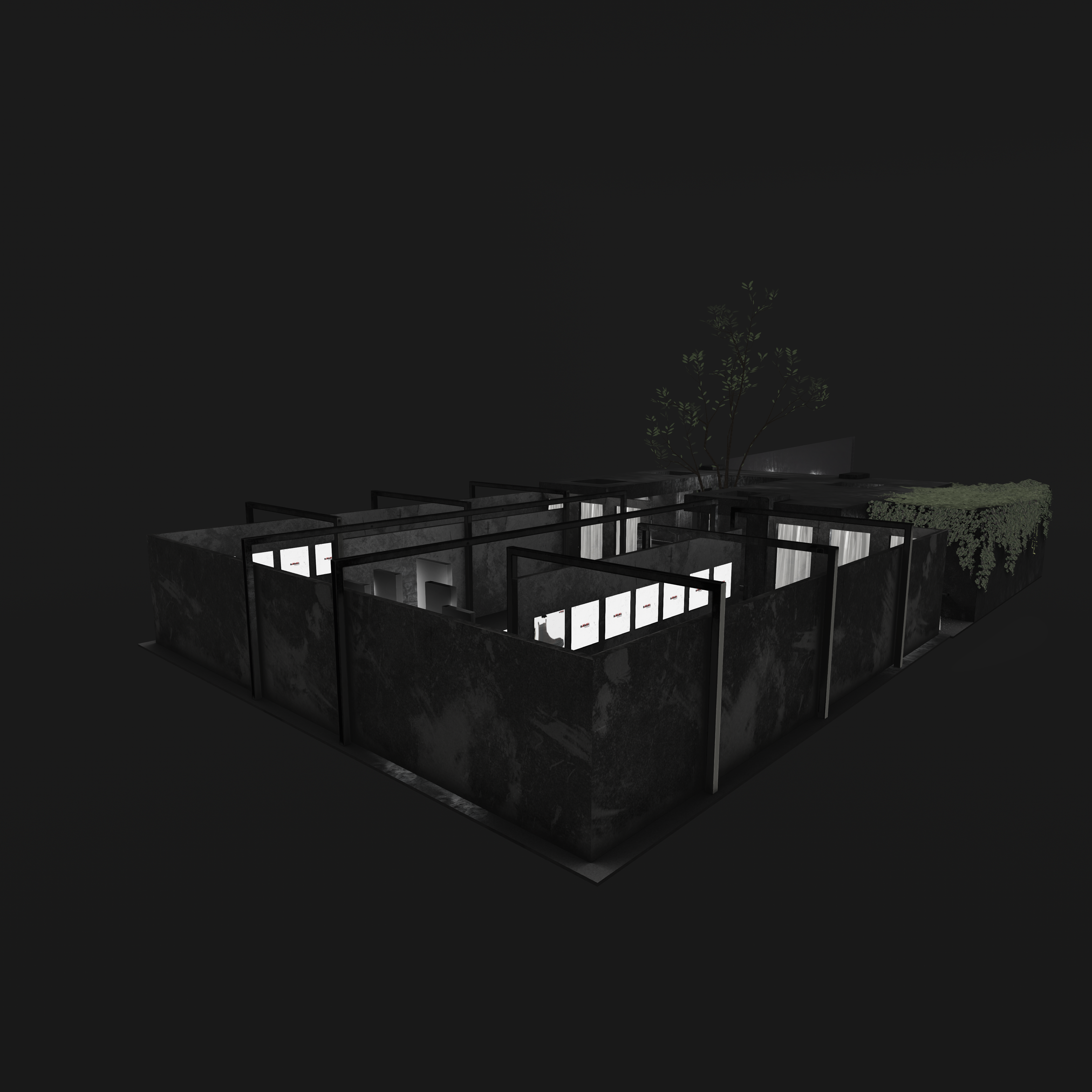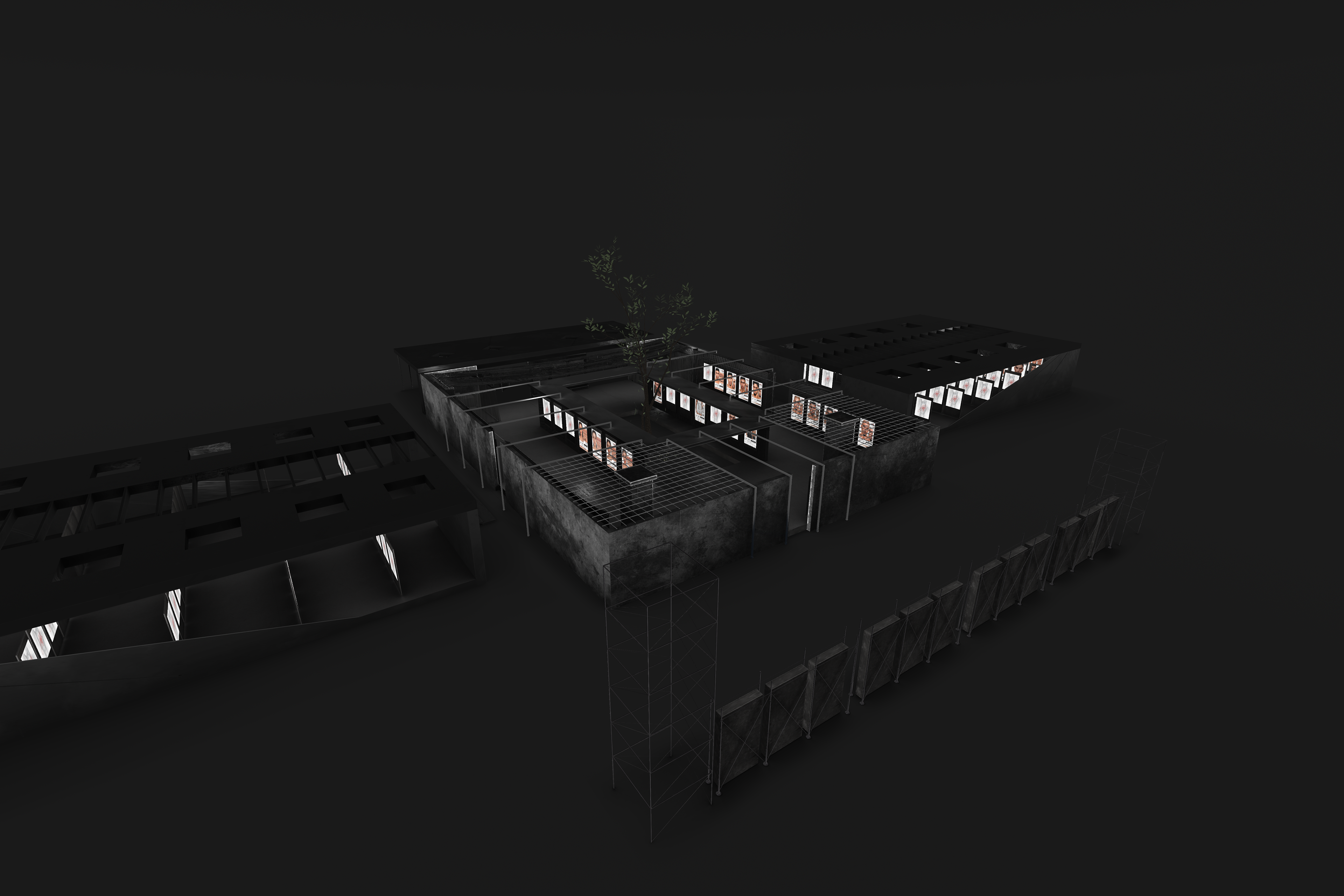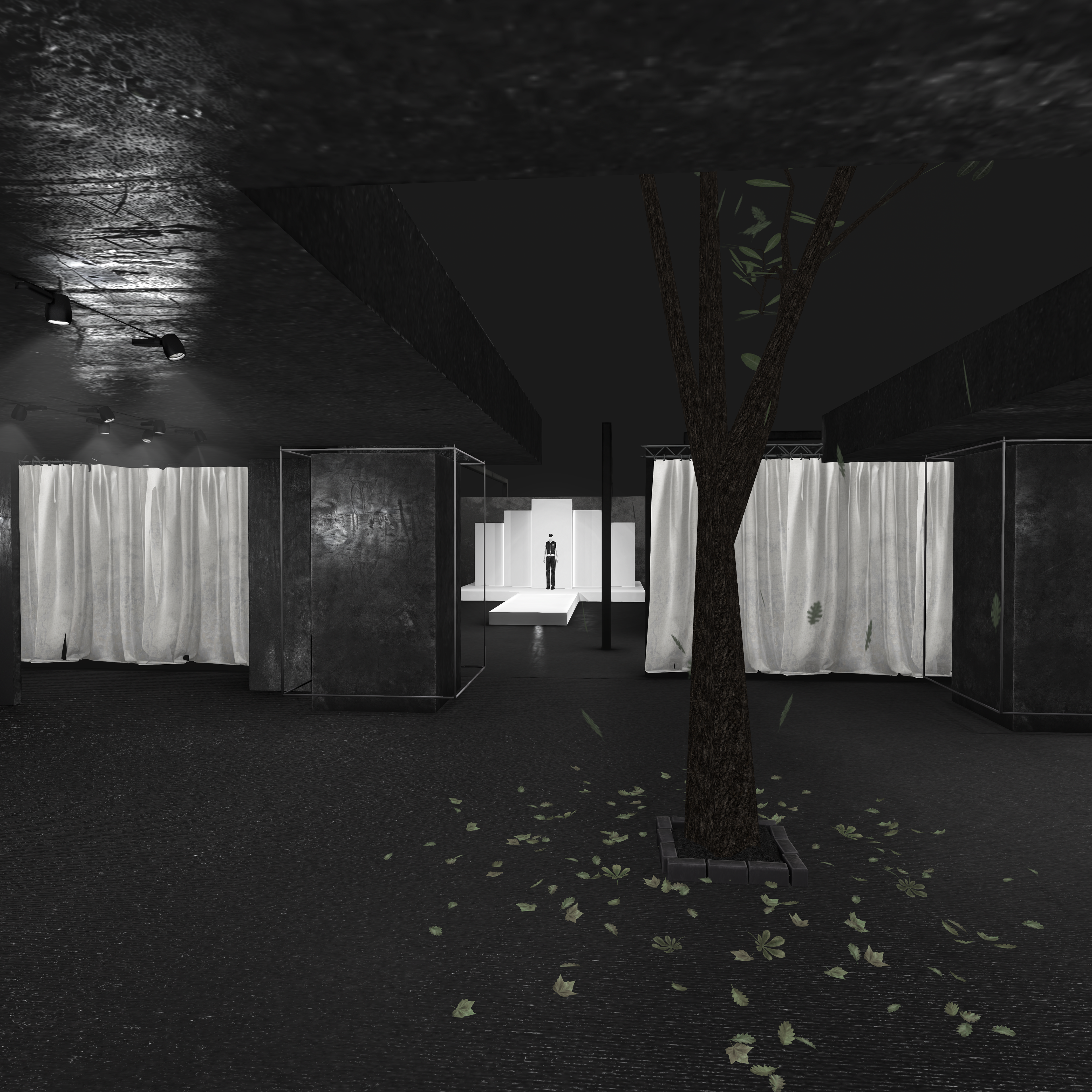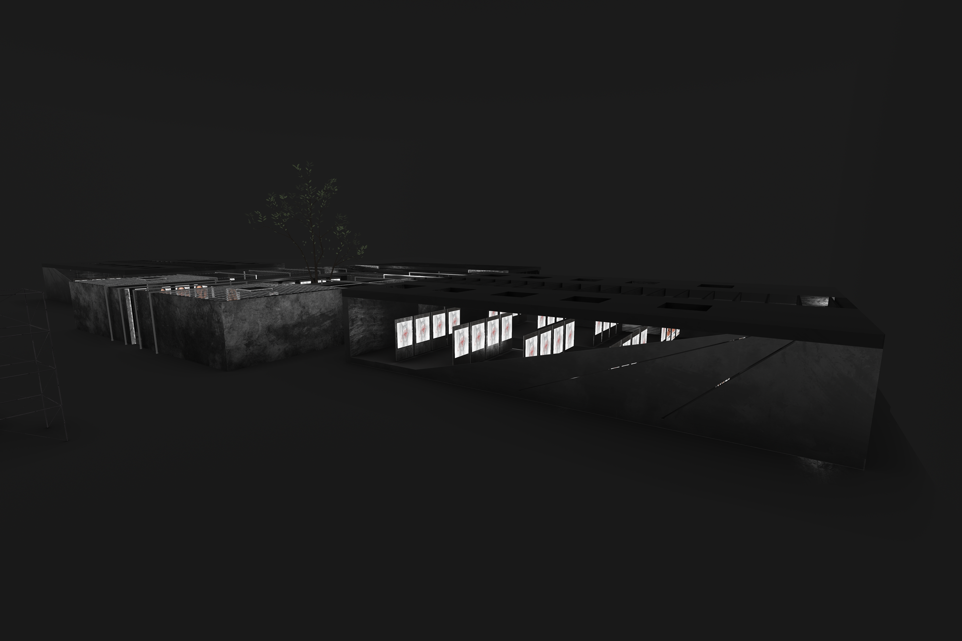 Overhead, mesh ceilings and linear lighting introduce a subtle sense of confinement and order — a nod to industrial architecture — while reflections and shadows across matte surfaces emphasize depth and contrast. A central open courtyard with a growing tree softens the space, serving as a visual counterpoint to the hard materials and structured geometry surrounding it.