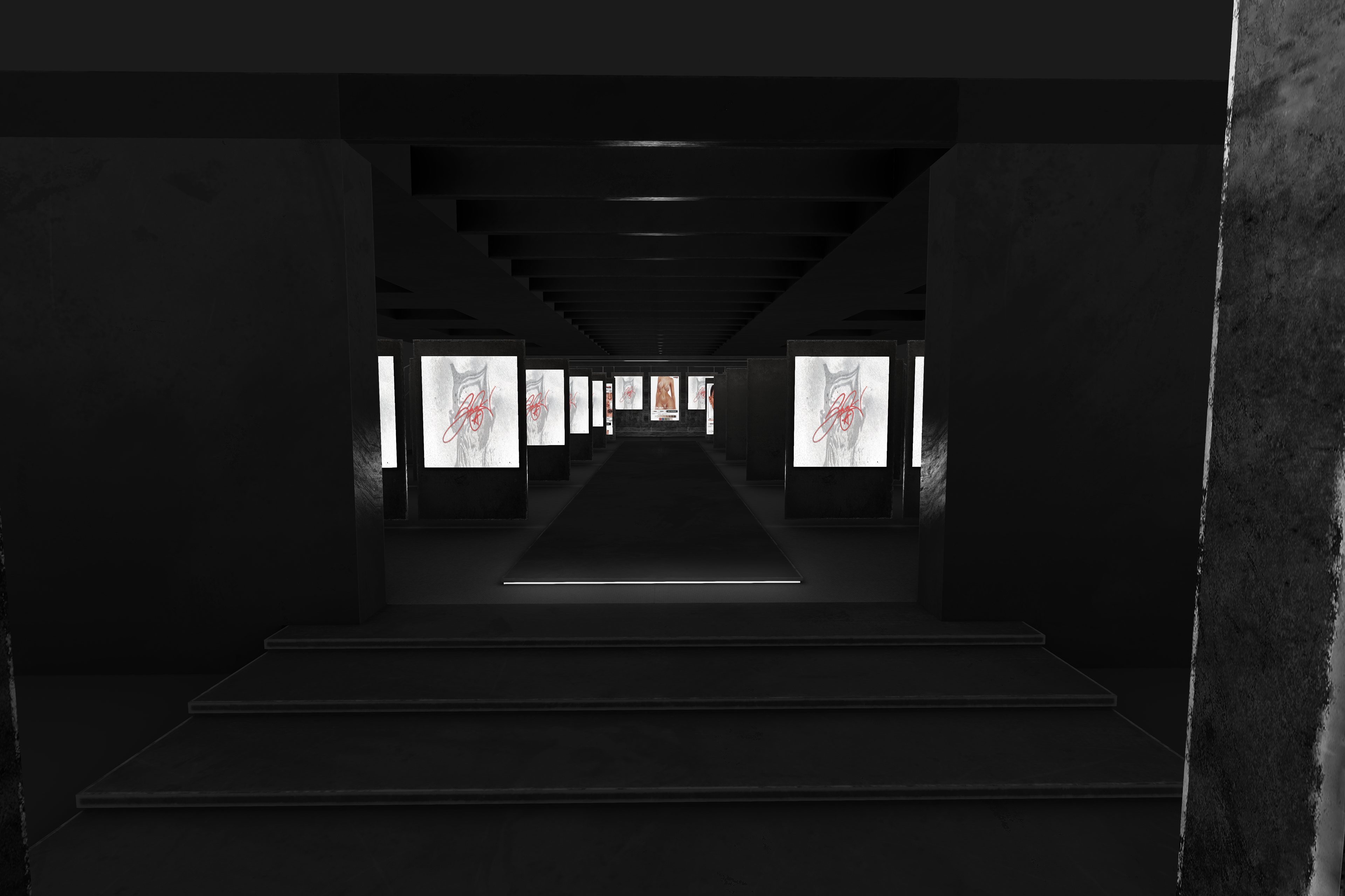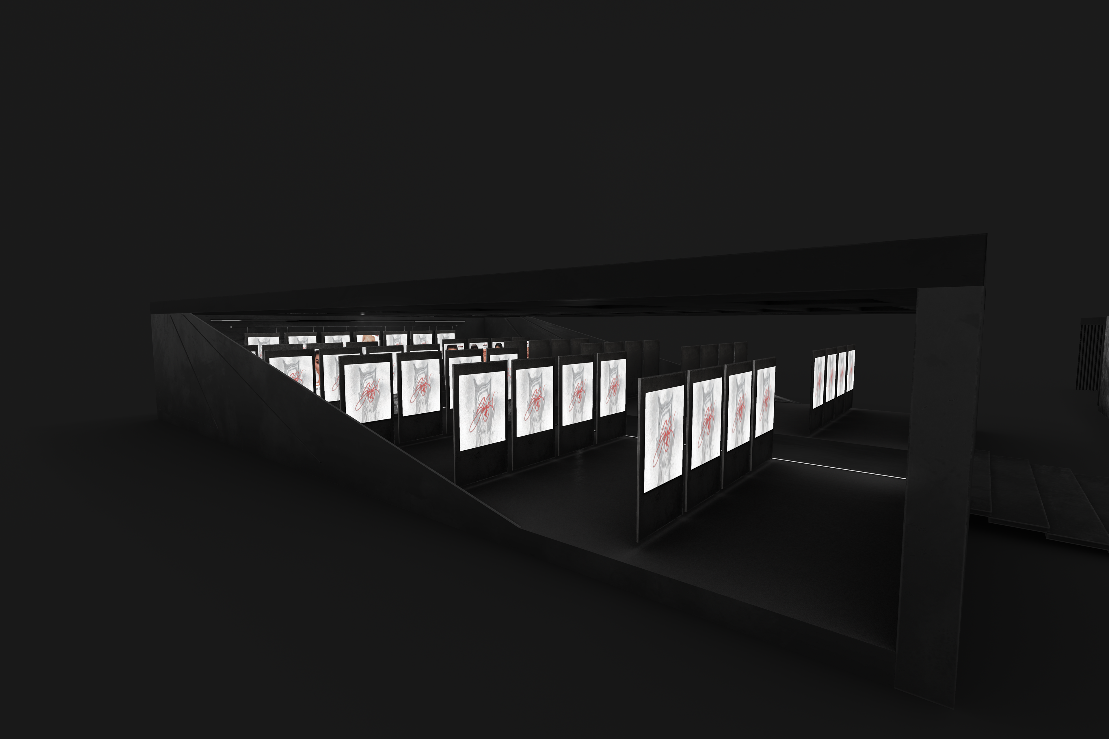 The environment is composed of large modular corridors lined with illuminated product displays, each framed within heavy concrete and black metal structures. The layout prioritizes clarity and rhythm, with clean sightlines guiding visitors through an organized visual progression of products.