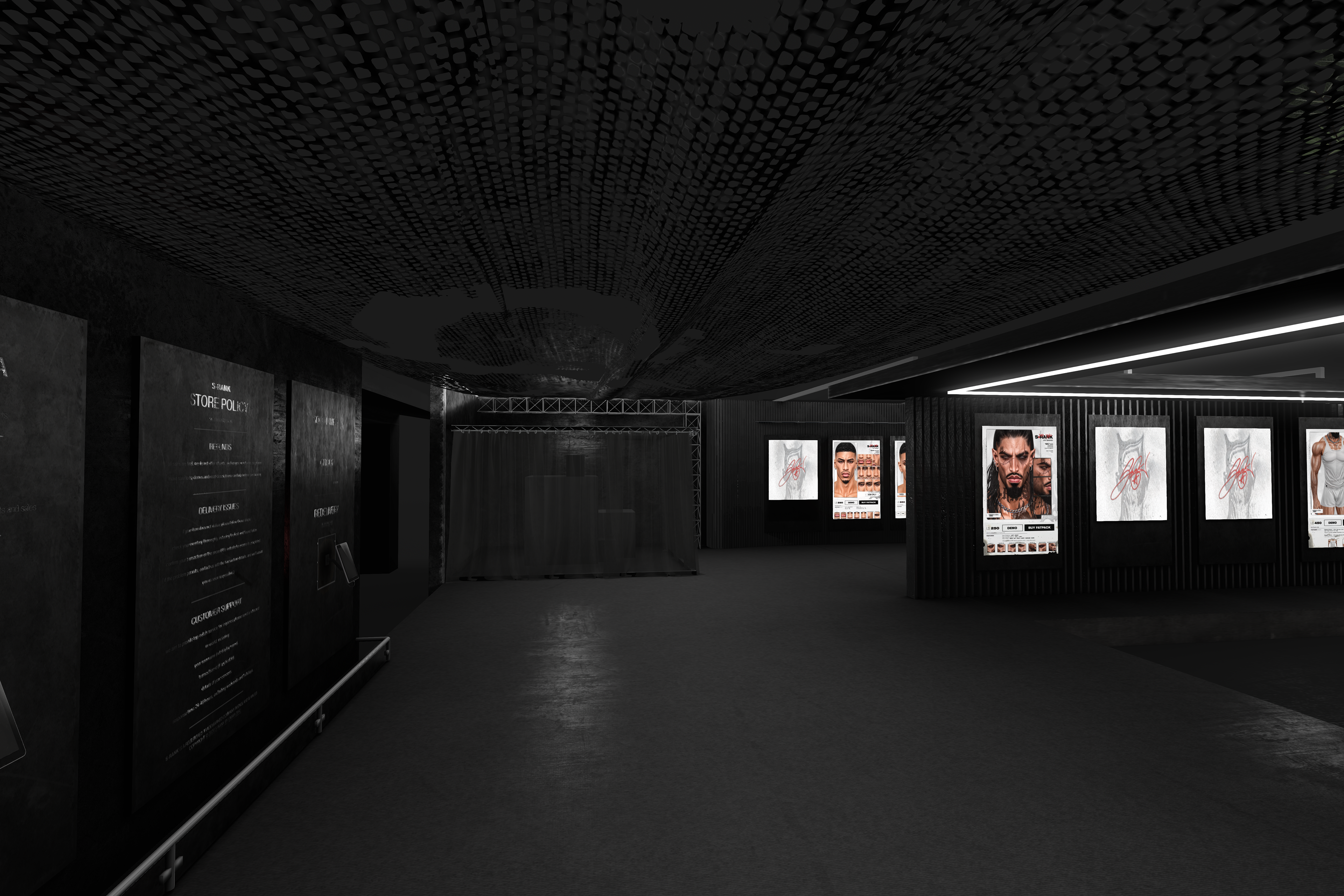 The Landing Point functions as the entry point and orientation zone of the S-RANK flagship. It establishes the brand’s aesthetic identity immediately upon arrival — a combination of grunge, industrial, and brutalist design language inspired in part by the environments of Metal Gear Solid.