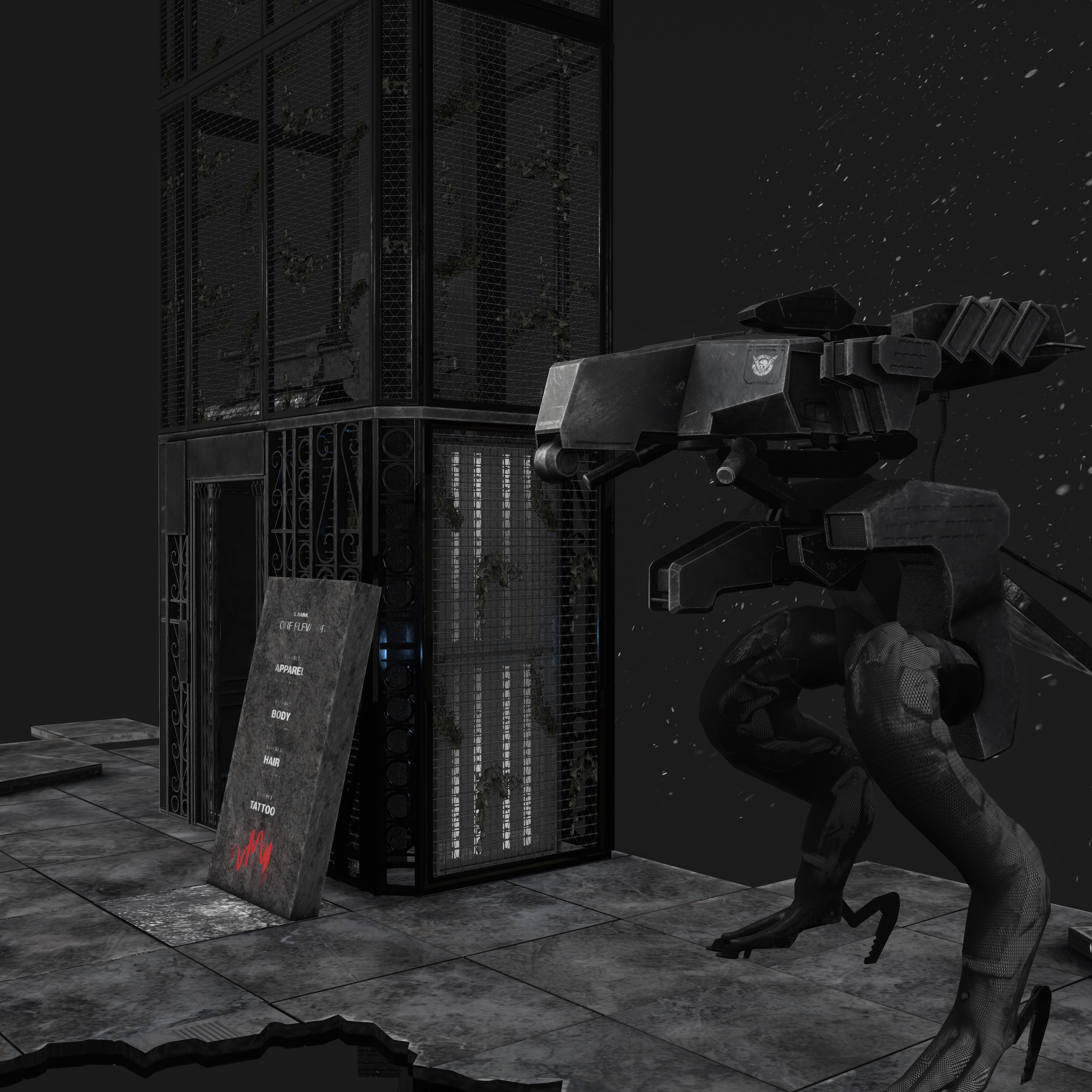 Every element of the environment, including the 3D architecture, modular structures, and spatial composition, was individually designed and modeled by me using Autodesk Maya and Blender. The textures, materials, and surface detailing were created in Adobe Substance Painter, ensuring a consistent, tactile realism across all surfaces.